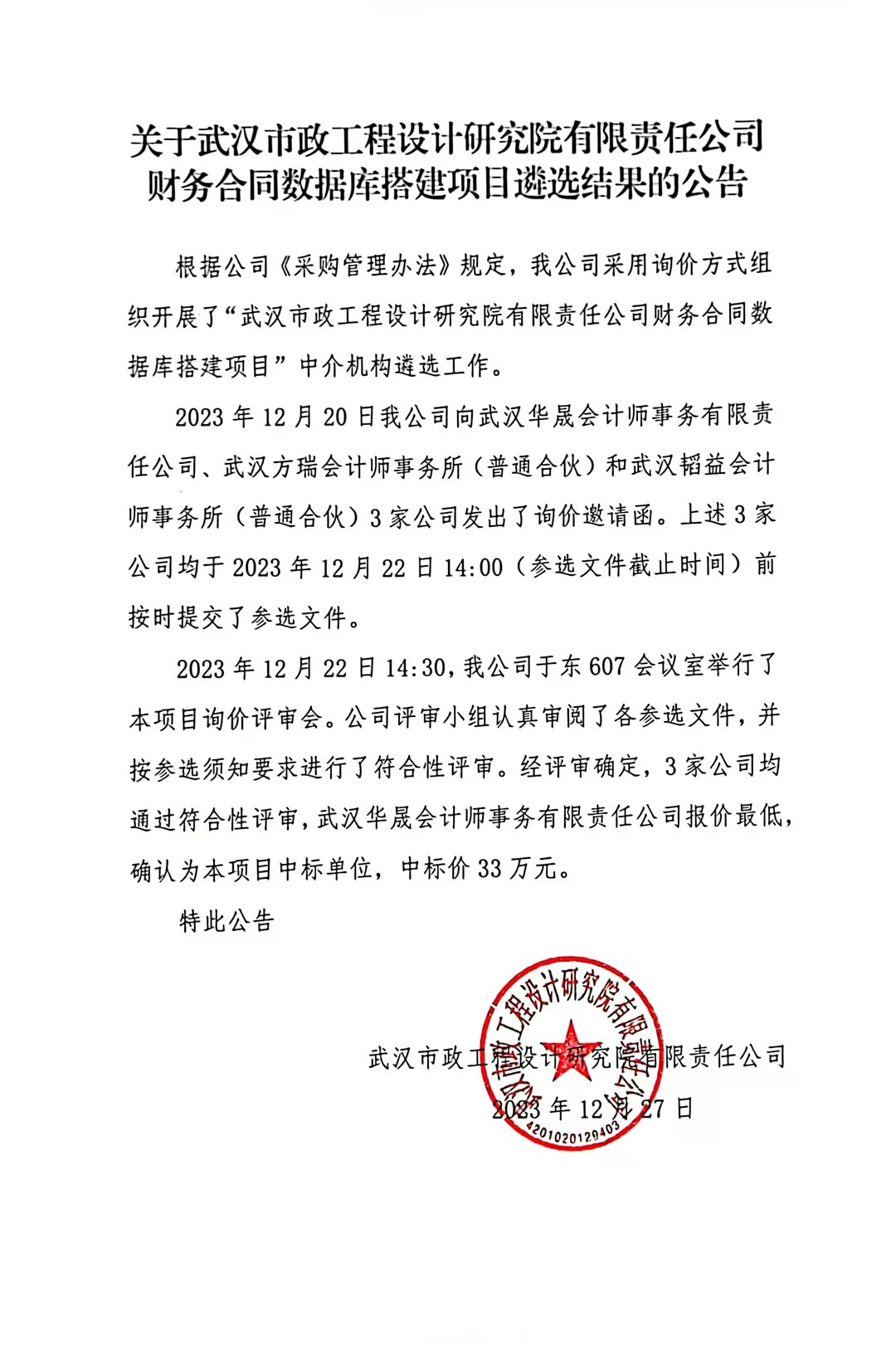 關(guān)于武漢市政工程設(shè)計(jì)研究院有限責(zé)任公司財(cái)務(wù)合同數(shù)據(jù)庫搭建項(xiàng)目遴選結(jié)果的公告