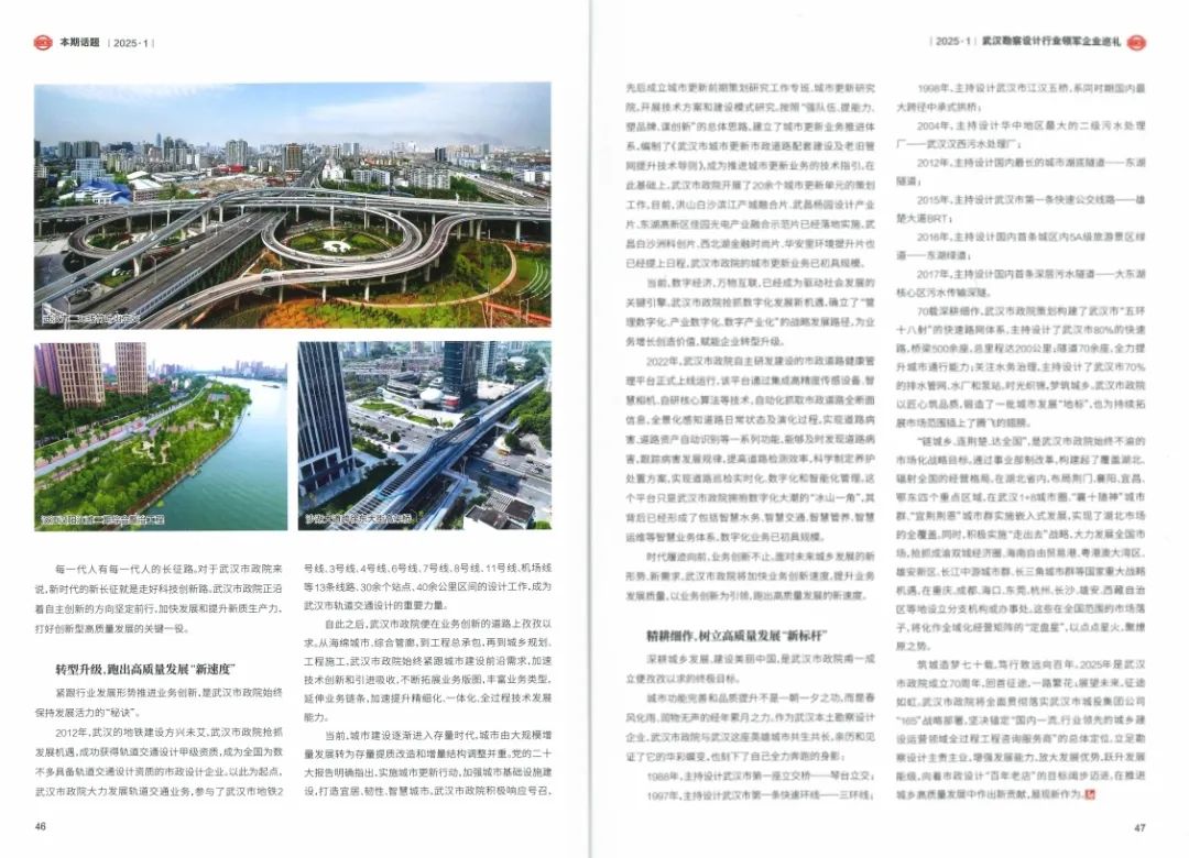 ? ? 近日,行業(yè)權(quán)威期刊《中國勘察設(shè)計》聚焦武漢勘察設(shè)計行業(yè),對領(lǐng)軍企業(yè)進行了專題報道。其中,武漢市政工程設(shè)計研究院有限責(zé)任公司(以下簡稱“武漢市政院”)以“聚焦能力建設(shè),深化改革轉(zhuǎn)型,加快構(gòu)建創(chuàng)新型高質(zhì)量發(fā)展新格局”為主題,分享了其在新時代背景下的創(chuàng)新實踐和發(fā)展成果,展示了企業(yè)在高質(zhì)量發(fā)展道路上勇毅前行的風(fēng)采和活力,引發(fā)了行業(yè)廣泛關(guān)注。
