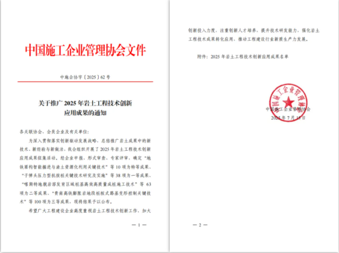 ? ? 近日,中國(guó)施工企業(yè)管理協(xié)會(huì)2025年巖土工程技術(shù)創(chuàng)新應(yīng)用成果結(jié)果正式揭曉。經(jīng)過(guò)企業(yè)申報(bào)、形式審查、專(zhuān)家評(píng)審等多個(gè)環(huán)節(jié)遴選,武漢市政院巖土博士創(chuàng)新工作室申報(bào)的“深厚富水圓礫層基坑地下水控制特種技術(shù)”、“敏感環(huán)境地鐵盾構(gòu)隧道穿越極硬巖特種技術(shù)”等2項(xiàng)技術(shù)創(chuàng)新性顯著,獲評(píng)為三等成果。