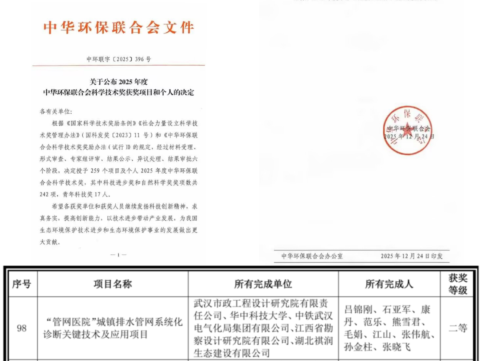 ? ? 近日,武漢市政院自主研發(fā)的“‘管網(wǎng)醫(yī)院’城鎮(zhèn)排水管網(wǎng)系統(tǒng)化診斷關(guān)鍵技術(shù)及應(yīng)用研究”,經(jīng)中華環(huán)保聯(lián)合會在北京組織技術(shù)成果評價(jià)會議評審,順利通過科技成果評價(jià),被認(rèn)定為達(dá)到“國際先進(jìn)水平”,并榮獲“2025年中華環(huán)保聯(lián)合會科技進(jìn)步獎二等獎”。