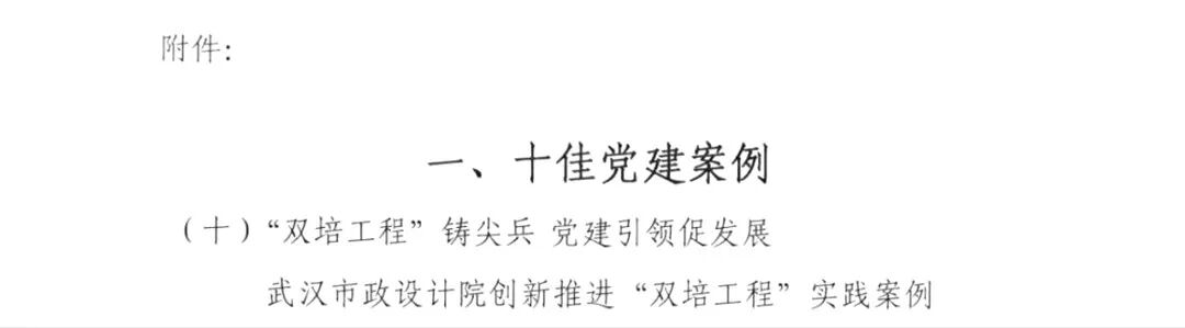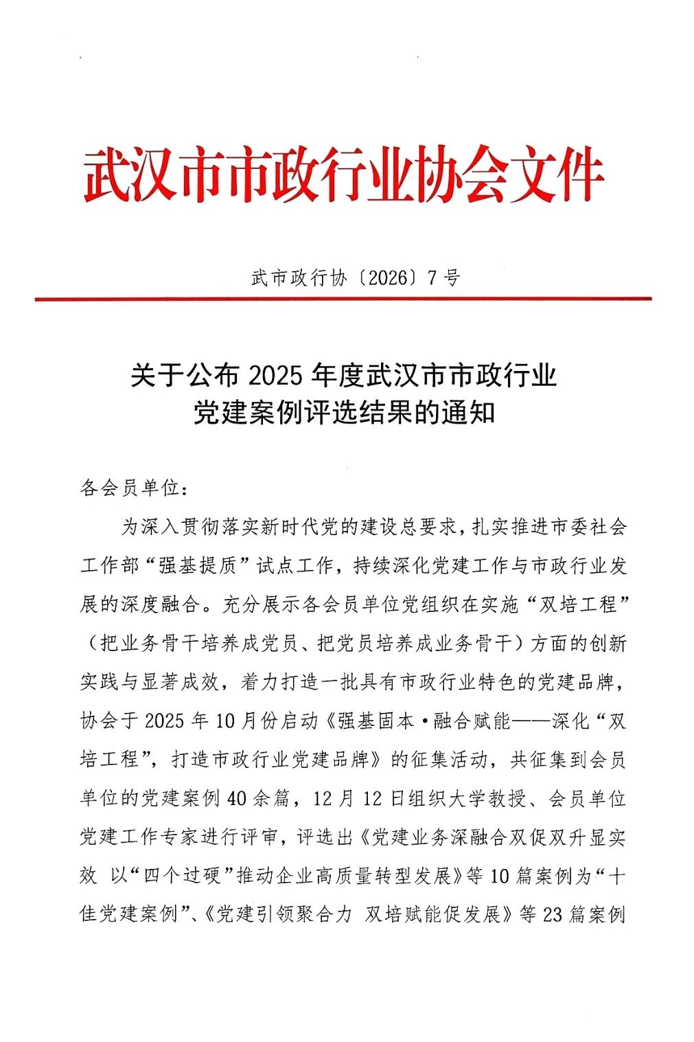 ? ? 近日,武漢市市政行業(yè)協(xié)會發(fā)布《2025年度武漢市市政行業(yè)黨建案例評選結(jié)果》,武漢市政院申報的創(chuàng)新實(shí)踐案例——《“雙培工程”鑄尖兵,黨建引領(lǐng)促發(fā)展》入選“十佳黨建案例”。