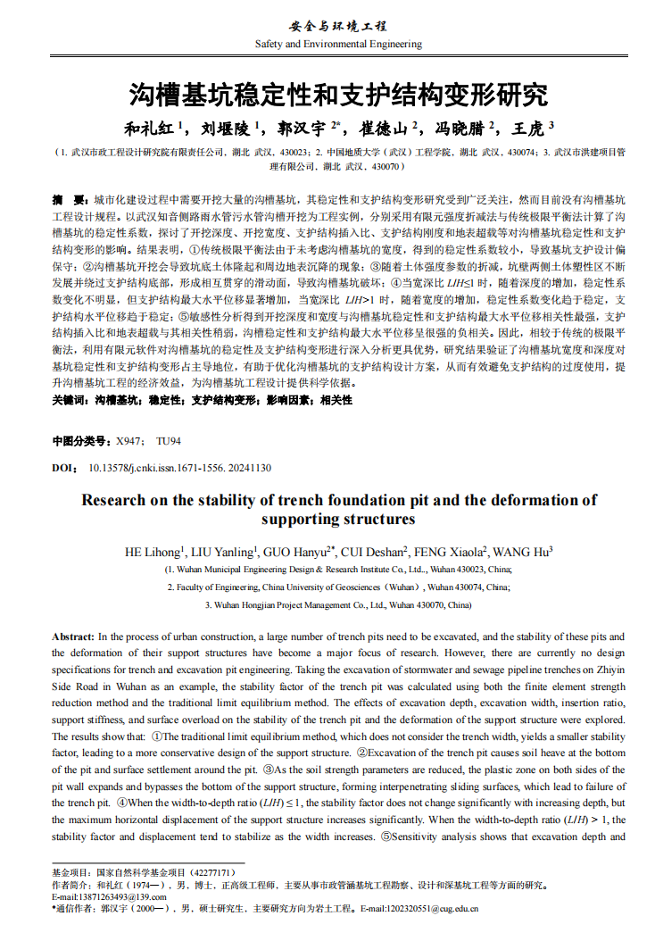 《市政管涵基坑穩(wěn)定性和支護結構變形研究》被中文核心期刊《安全與環(huán)境工程》正式錄用。論文圍繞市政管涵基坑工程的核心安全問題,通過大量工程實踐與理論分析,為基坑穩(wěn)定性評價與變形控制提供了堅實的理論支撐與計算方法。