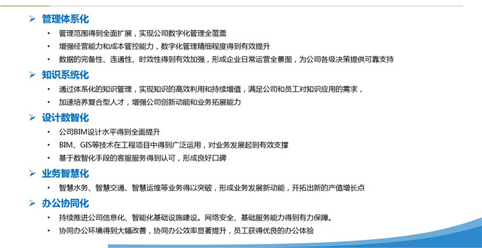 信息中心對《公司2021-2023年數字化建設發(fā)展綱要》進行了宣貫。近年來,公司緊跟行業(yè)發(fā)展形勢,立足公司實際需要,開展了以日常運營、項目管理、智慧平臺、移動辦公等為主要內容的數字化建設工作,取得了積極成效?!毒V要》立足當前公司數字化發(fā)展需求,提出了管理體系化、知識系統(tǒng)化、設計數智化、業(yè)務智慧化、辦公協同化五個方面的發(fā)展目標,明確了各方面的建設內容及相關組織保障。