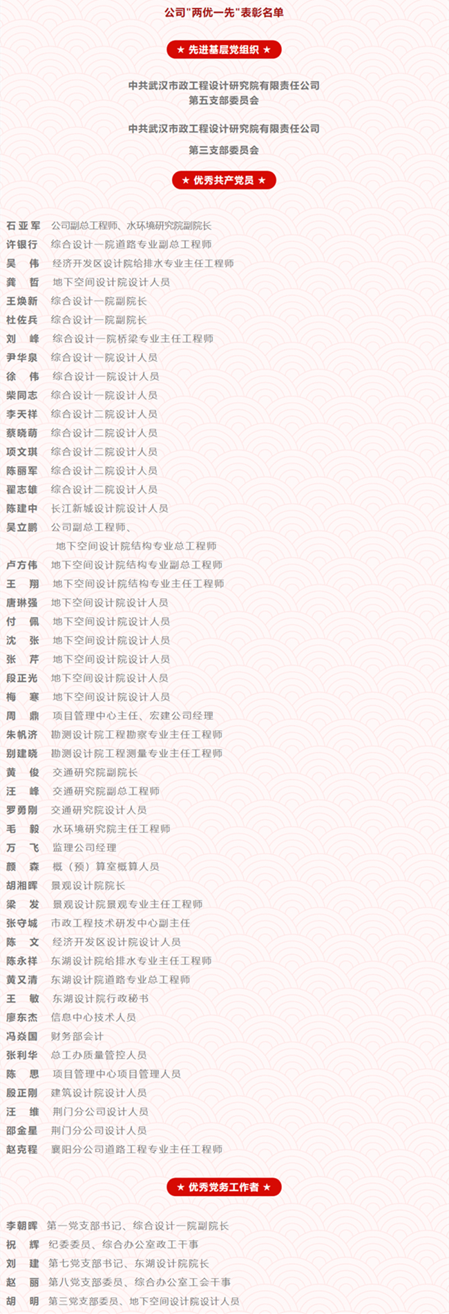 公司綜合設(shè)計(jì)一院道路專業(yè)副總工程師許銀行、經(jīng)濟(jì)開發(fā)區(qū)設(shè)計(jì)院給排水專業(yè)主任工程師吳偉、地下空間設(shè)計(jì)院設(shè)計(jì)人員龔哲榮獲市城投集團(tuán)公司“優(yōu)秀共產(chǎn)黨員”稱號(hào);