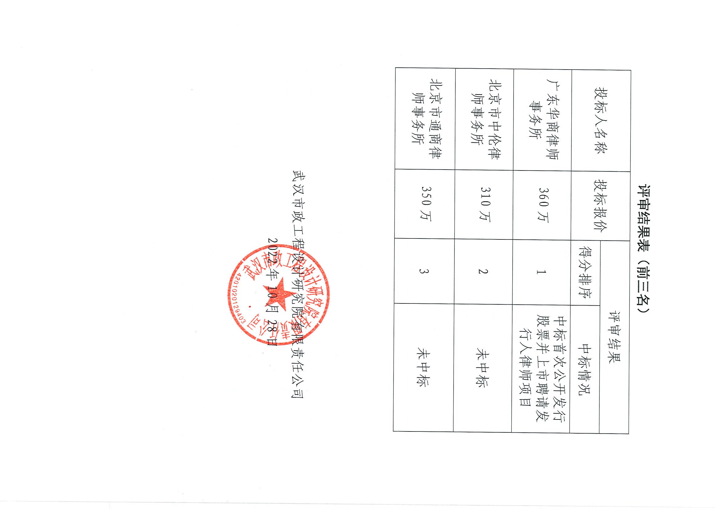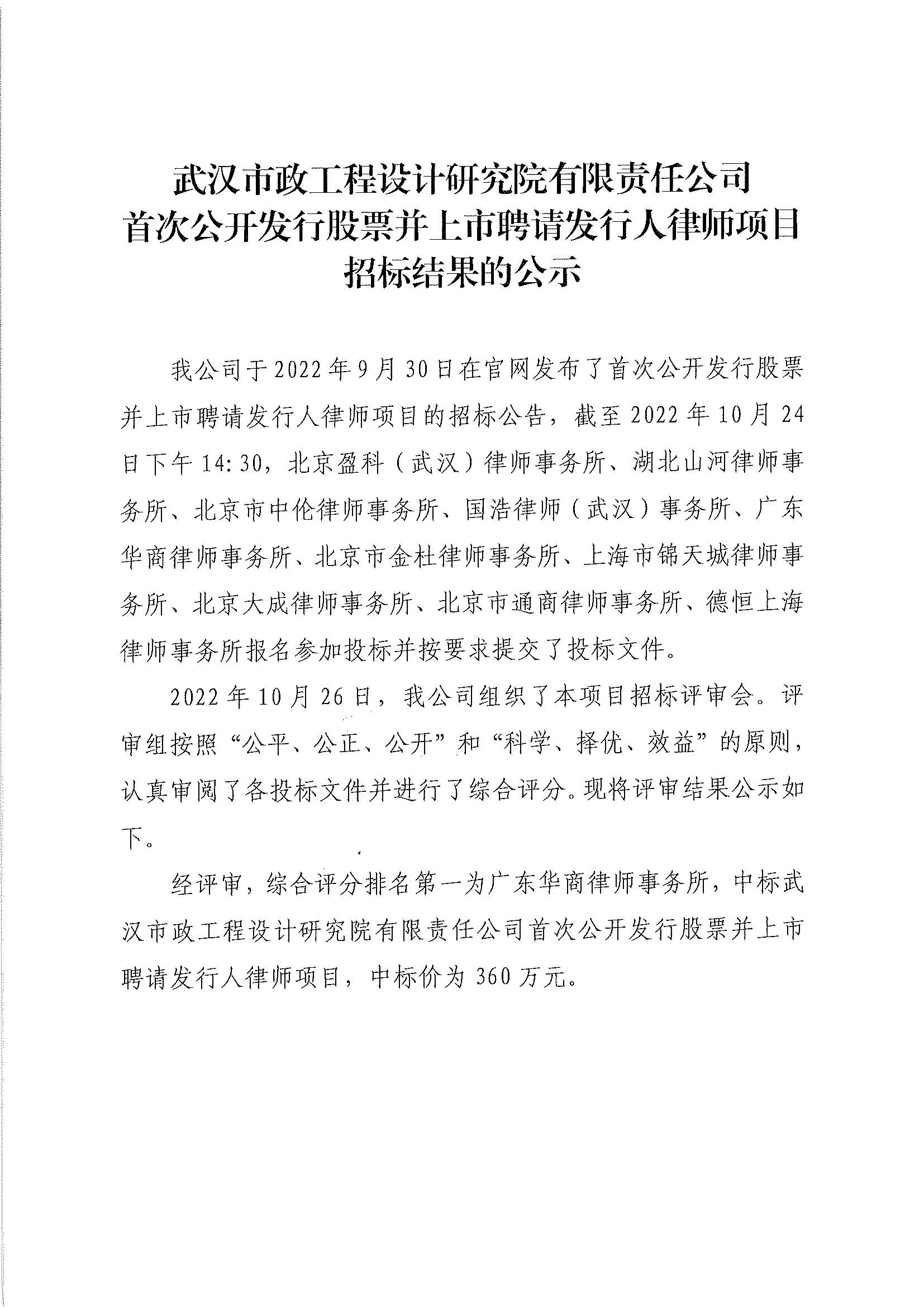 武漢市政工程設計研究院有限責任公司首次公開發(fā)行股票并上市聘請發(fā)行人律師項目招標結果的公示