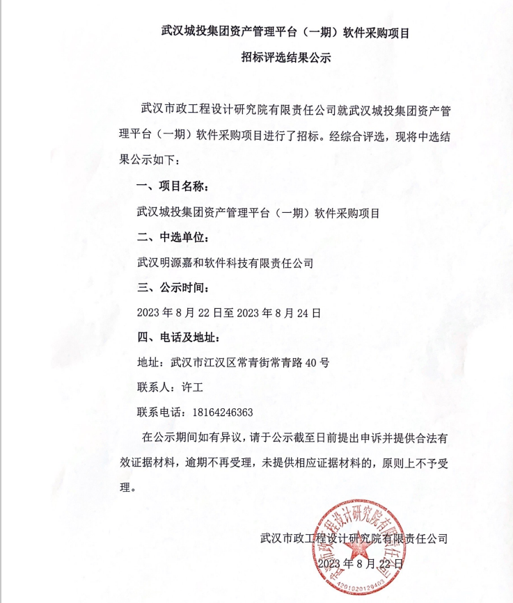 武漢城投集團資產(chǎn)管理平臺(一期)軟件采購項目招標評選結(jié)果公示